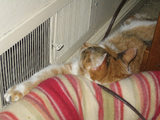 I'm beginning to think she has the right idea. She has been sacked out all day as close to the heating vent as she can get. She is wedged between the wall and an end table. What's that she's using as a pillow, you ask? A nice warm kitty bed......No, she won't actually get in the nice warm kitty bed, she just likes to use it as a pillow.
